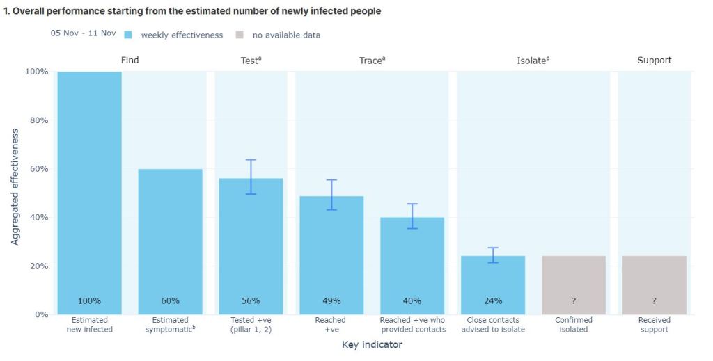 The national Test and Trace is a disaster. Its design means that it cannot possibly contain outbreaks of covid-19. It is obsessed with testing at the expense of all the other necessary links in the chain of actions needed to control outbreaks. It fails to detect asymptomatic people and those who are unwilling or unable to be tested and it ignores false negatives. This means that before it starts, it has potentially missed up to 80% of those who are infectious. It then loses cases at each of the stages of informing the index case, collecting information on contacts, reaching those contacts, and then persuading them to self-isolate. Probably less than 20% of those advised will effectively self-isolate. The national Test and Trace fails dismally to find cases at the start of the process and then fails dismally at the other end of the process in supporting people through the difficulties encountered in trying to effectively self-isolate. It is likely that less than 5% of the contacts of those who are currently infectious with covid-19 self-isolate effectively. We as tax payers are paying billions of pounds for this failure.