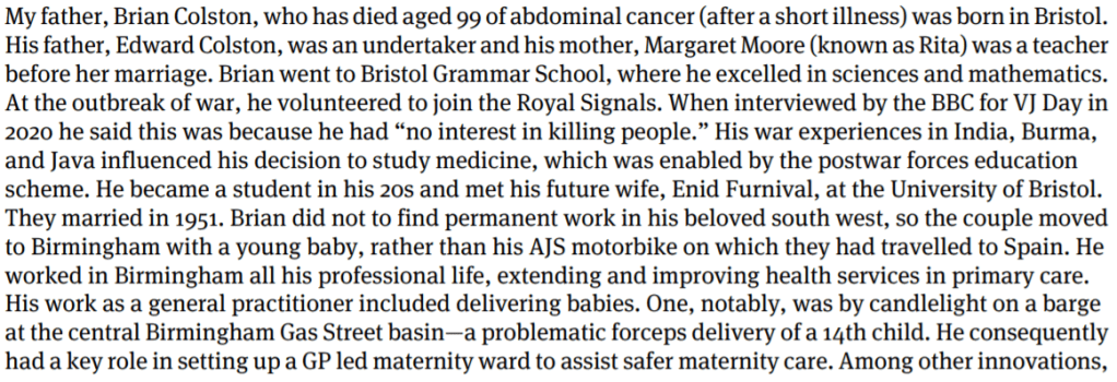 After retiring in 1991 he moved to Devon to enjoy his passion for sailing, as well as gardening and photography, before returning to Birmingham with Enid to spend his last years. He was a thoughtful, kind and generous man who dedicated his life to the health and wellbeing of the people of inner-city Birmingham.